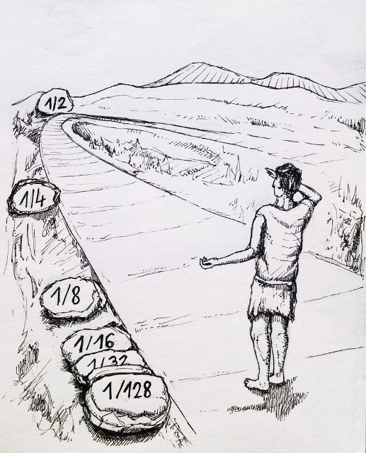 -Paradox půlení = Paradox půlení či dichotomie argumentuje takto: představme si, že někdo chce uběhnout vzdálenost 100 m. Než se tam ale dostane, musí uběhnout 50 m, předtím už 25 m a tak dále až do nekonečna. Takže se „nemůže“ hnout z místa, protože každý pohyb vyžaduje nekonečně mnoho dílčích přesunů.-.jpg)
